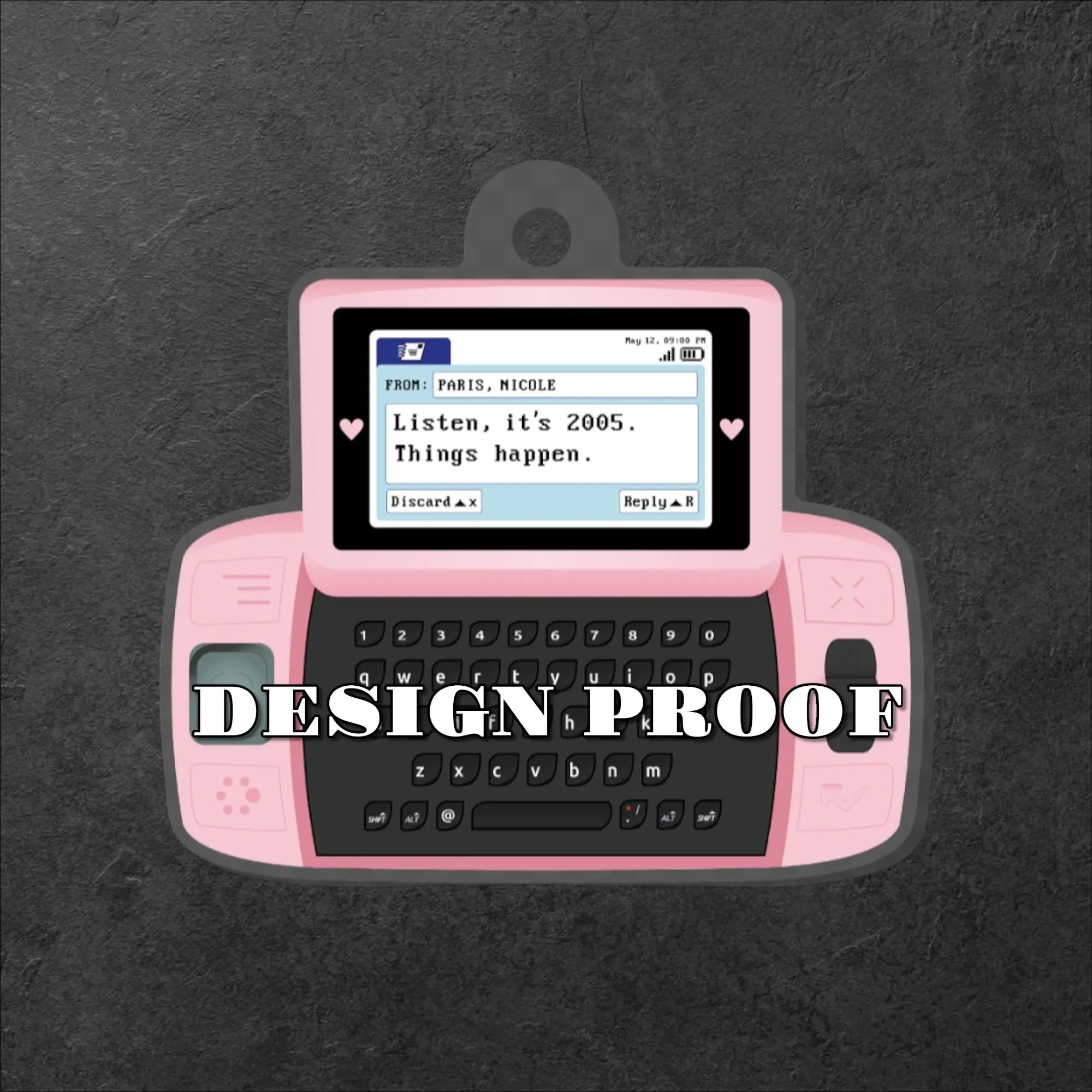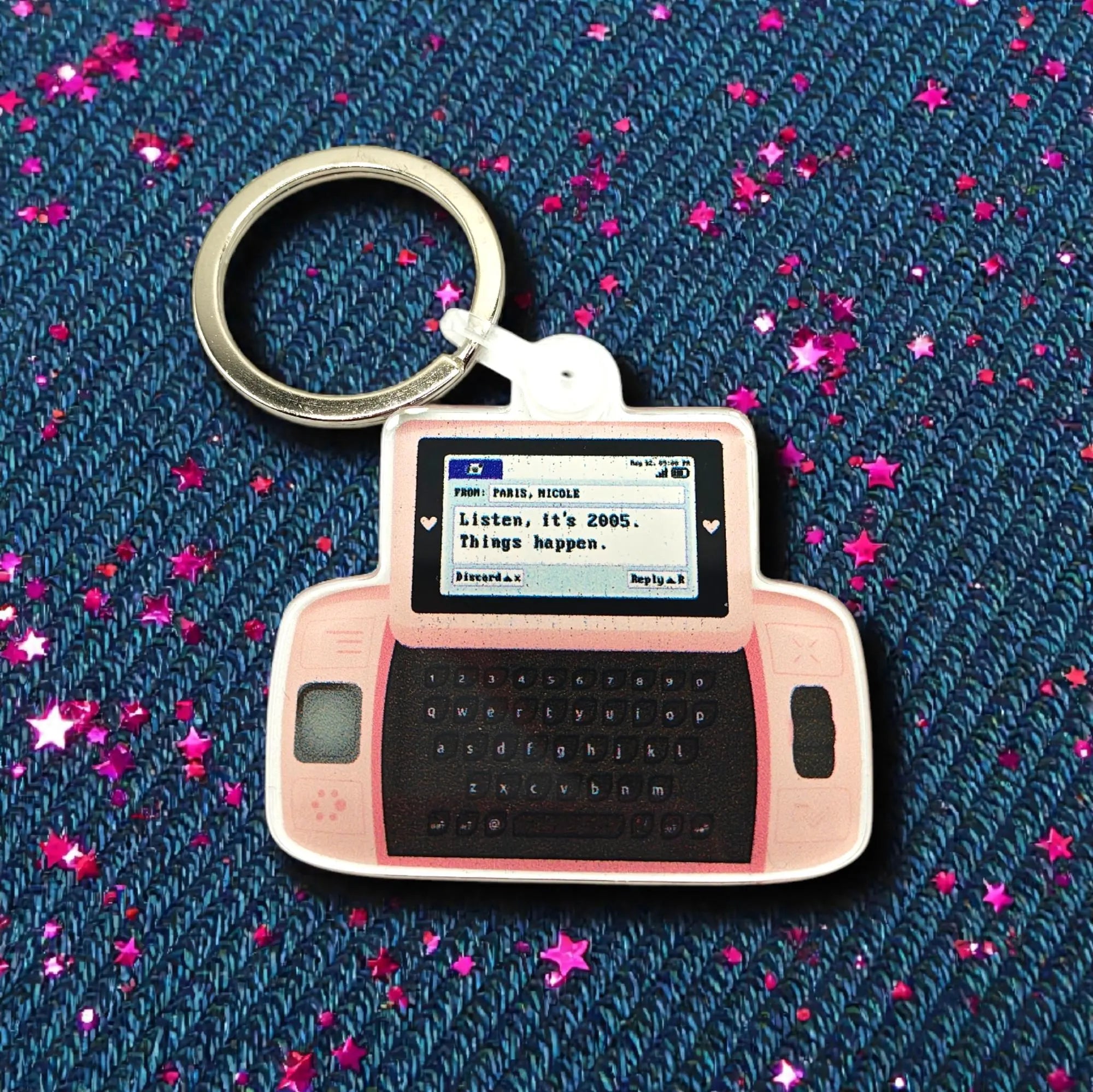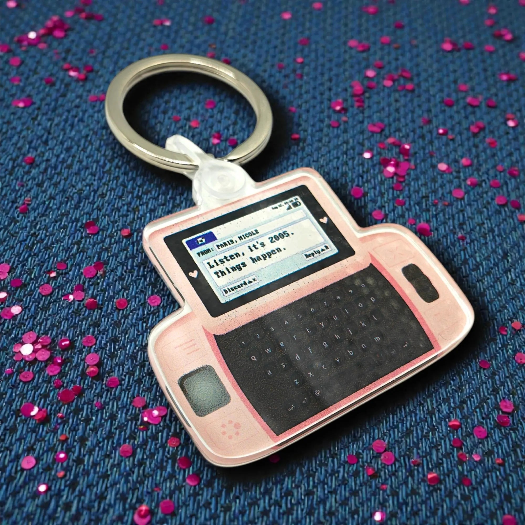 These acrylic keychains are inspired by the most iconic phone of the early 2000s, and measure 2” x 1.61”