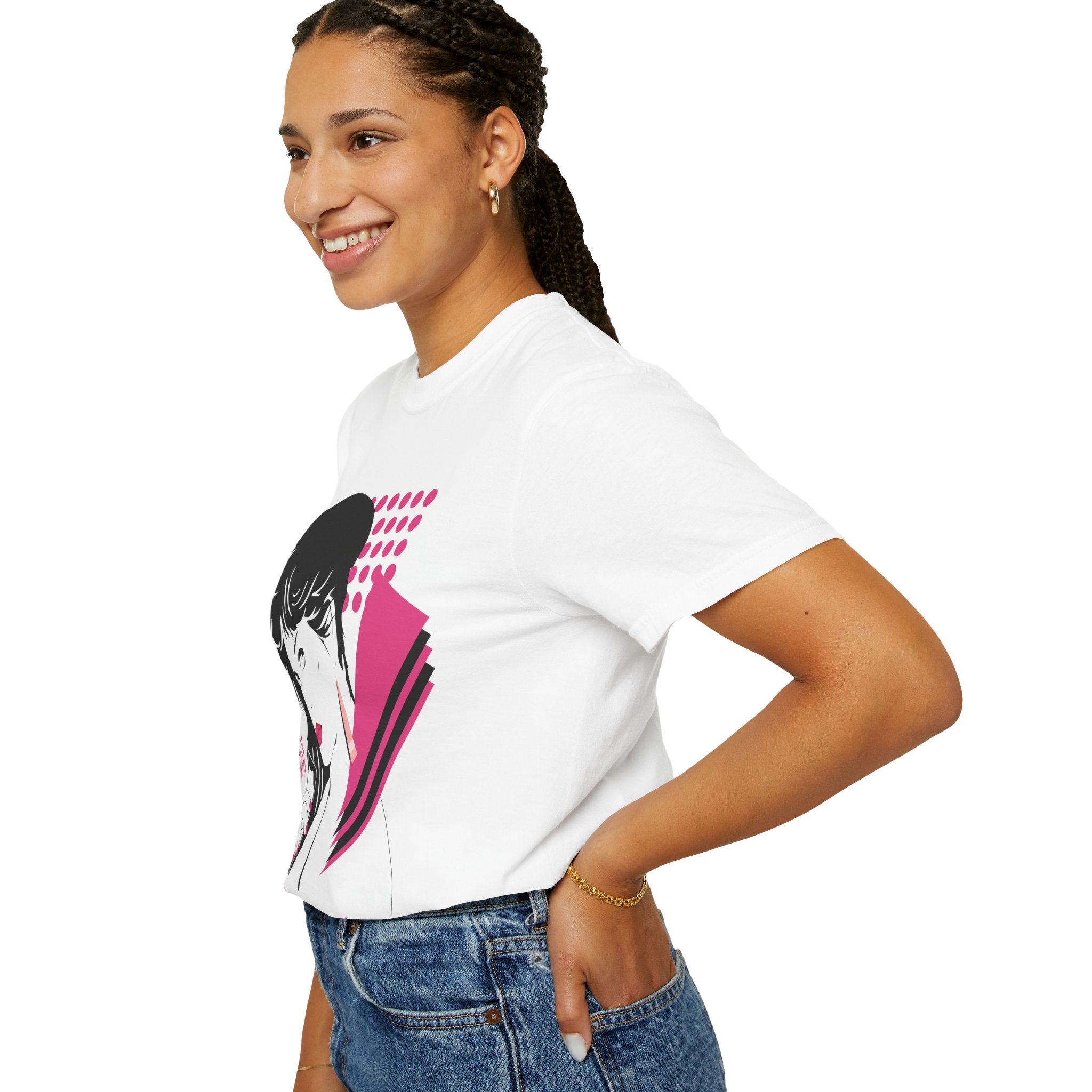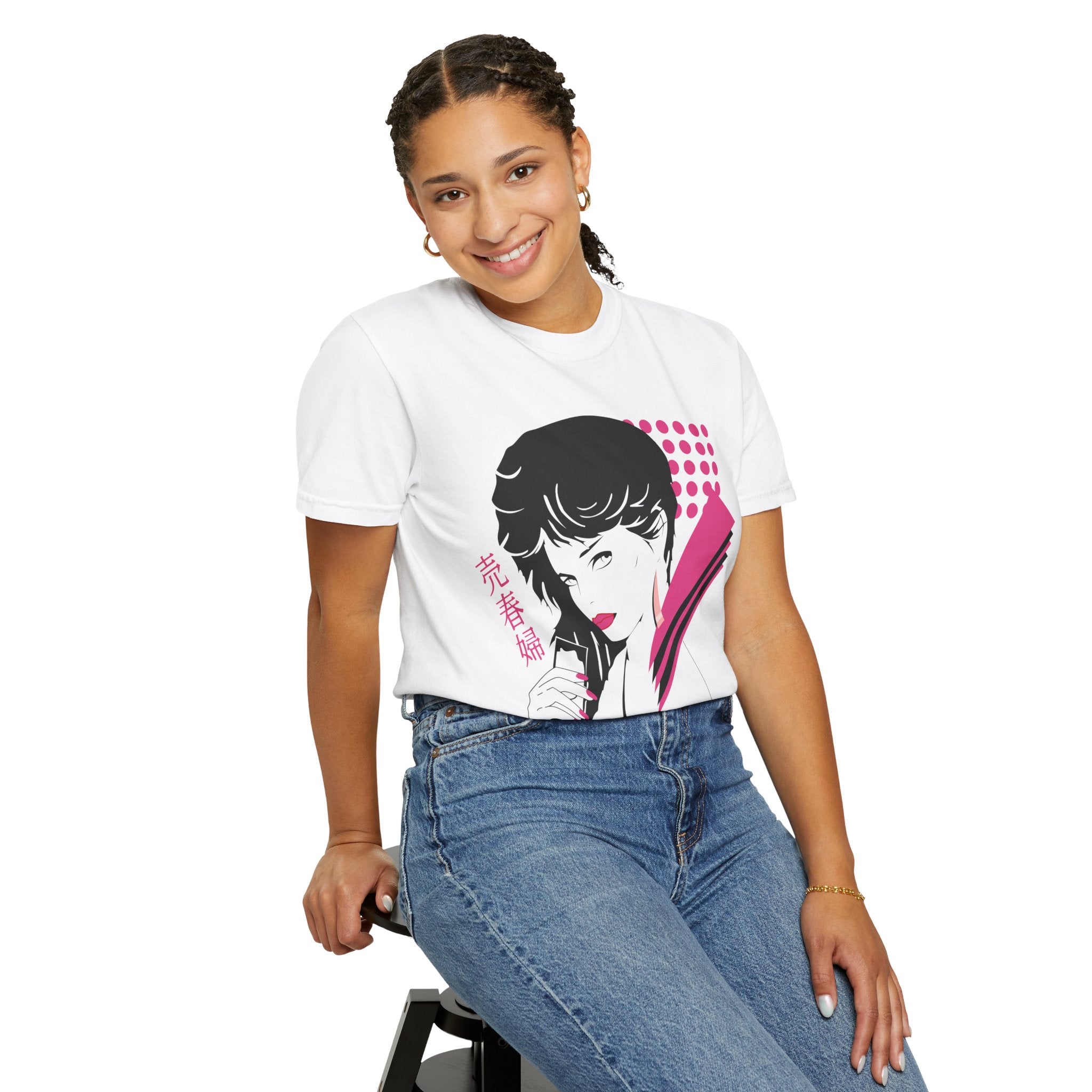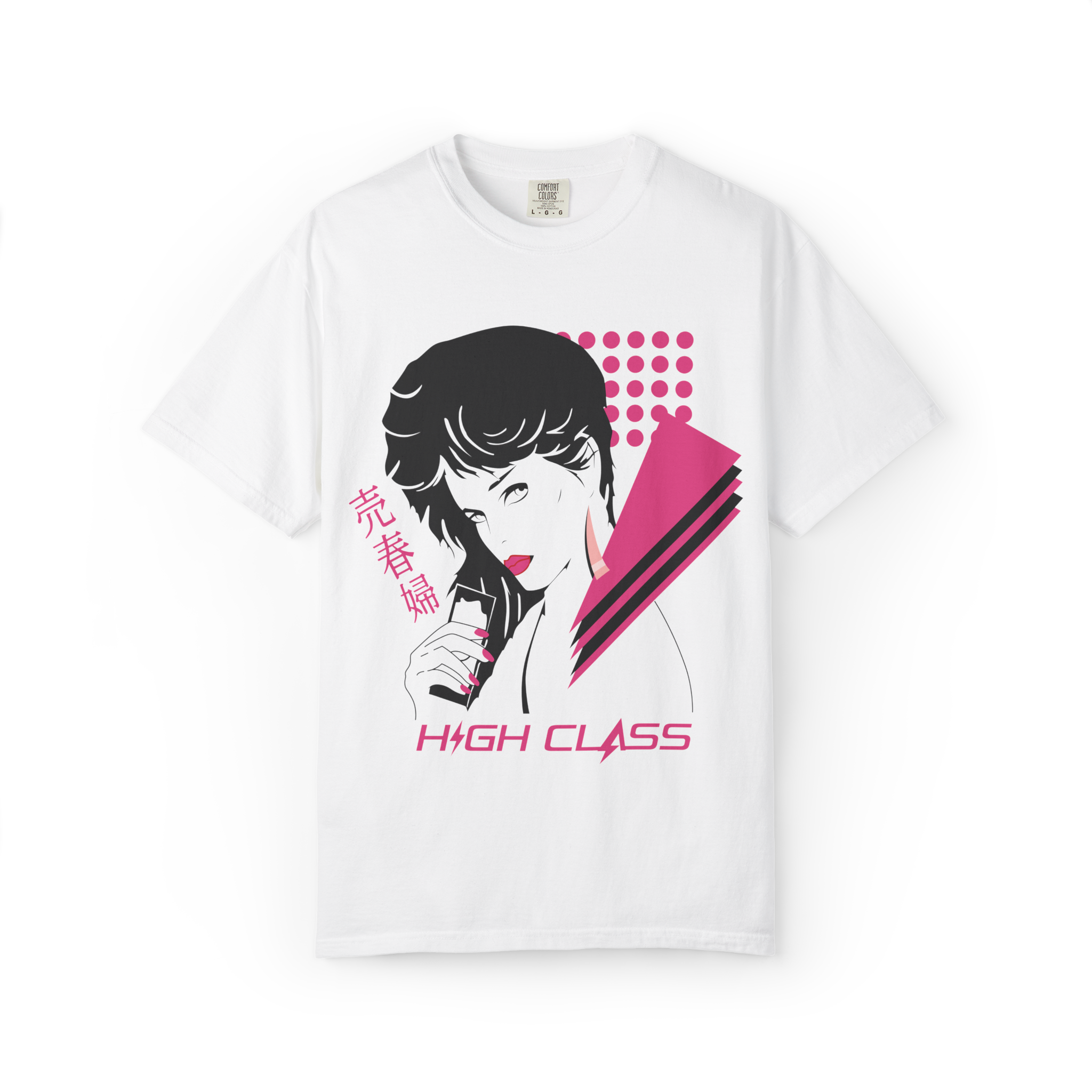Inspired by the iconic So Yesterday music video, this design captures the cool, effortless confidence that defined the era. The front graphic blends Patrick Nagel–style glamour, vaporwave tones, and nail-salon poster aesthetics into a striking portrait filled with sharp shapes, magenta halftones, and retro geometric accents. It feels like a lost 80s fashion cover rediscovered through a Y2K lens.