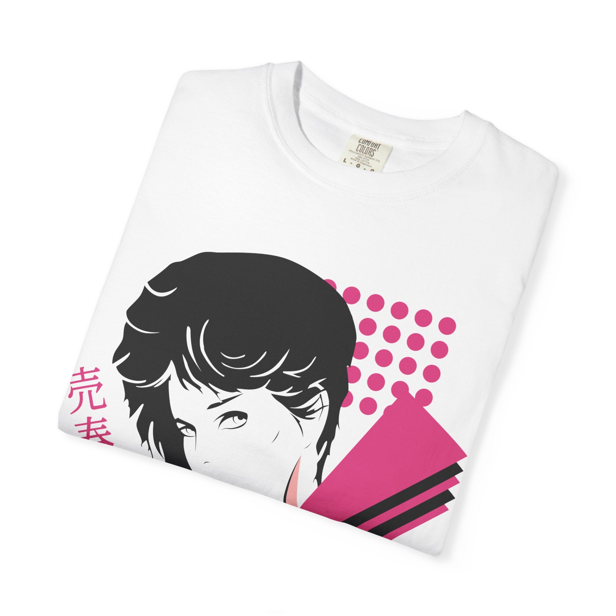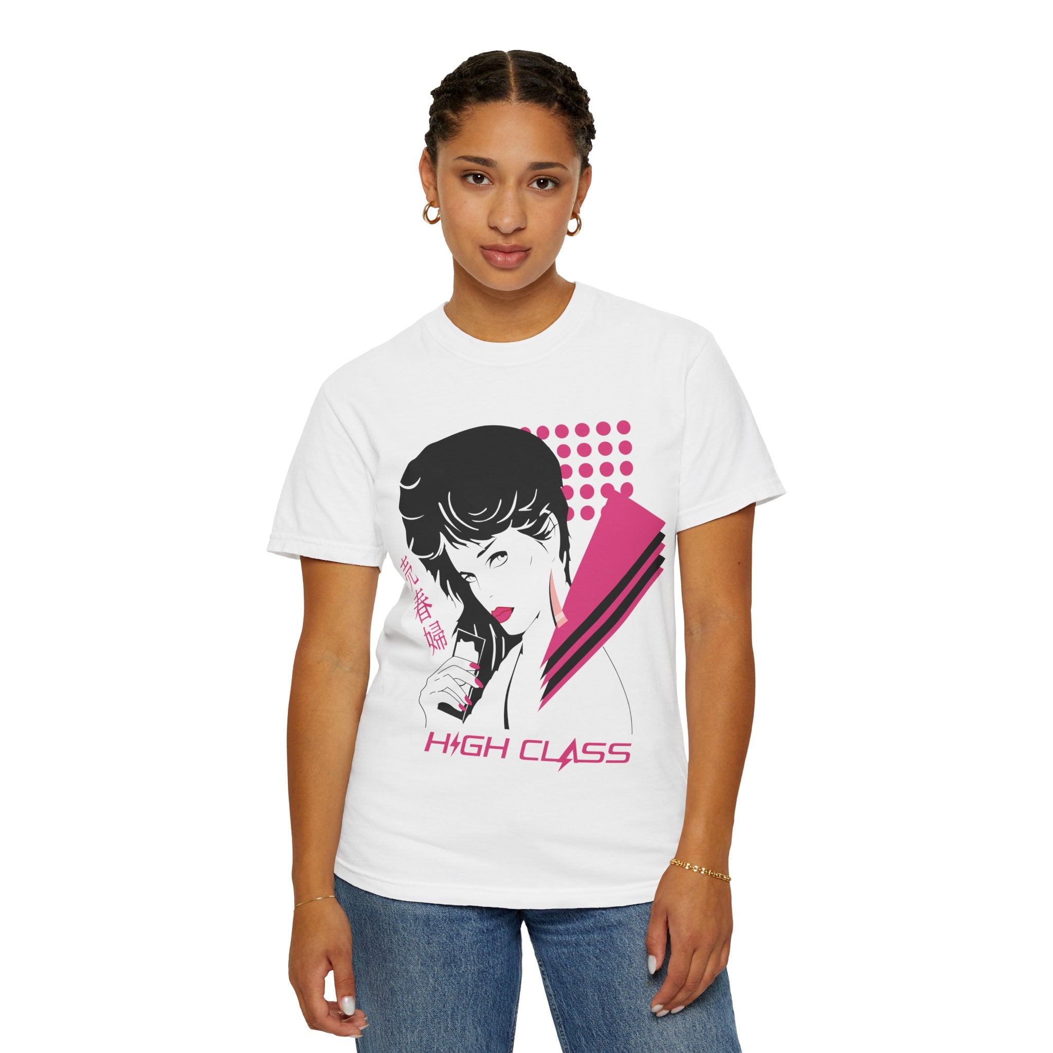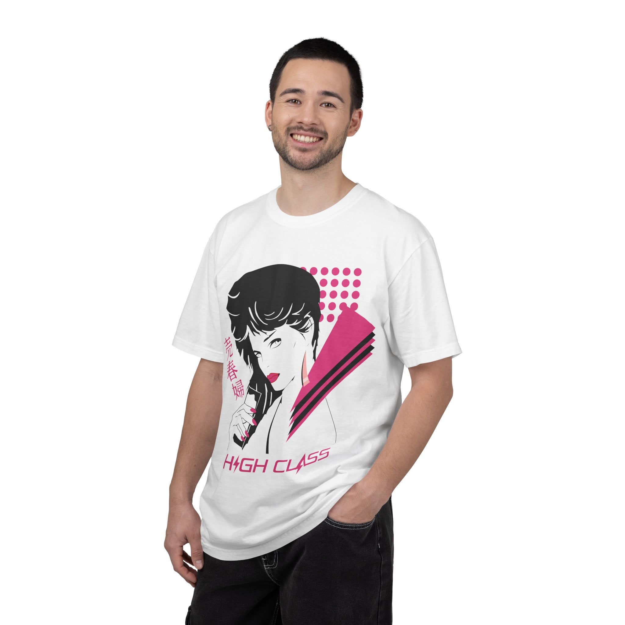 Inspired by the iconic So Yesterday music video, this design captures the cool, effortless confidence that defined the era. The front graphic blends Patrick Nagel–style glamour, vaporwave tones, and nail-salon poster aesthetics into a striking portrait filled with sharp shapes, magenta halftones, and retro geometric accents. It feels like a lost 80s fashion cover rediscovered through a Y2K lens.