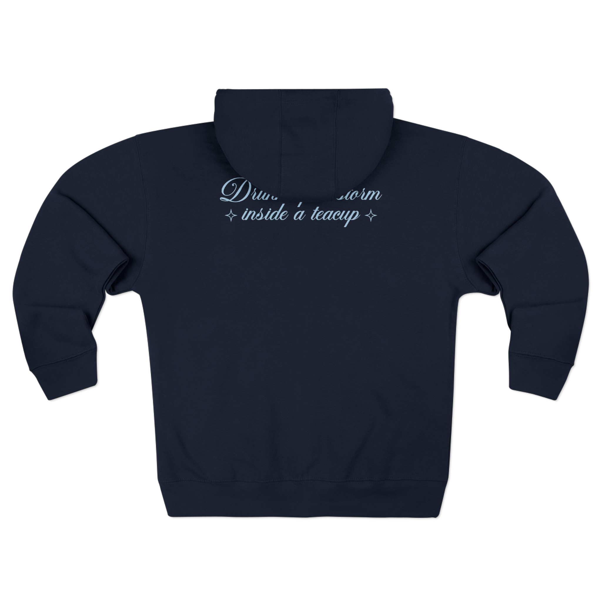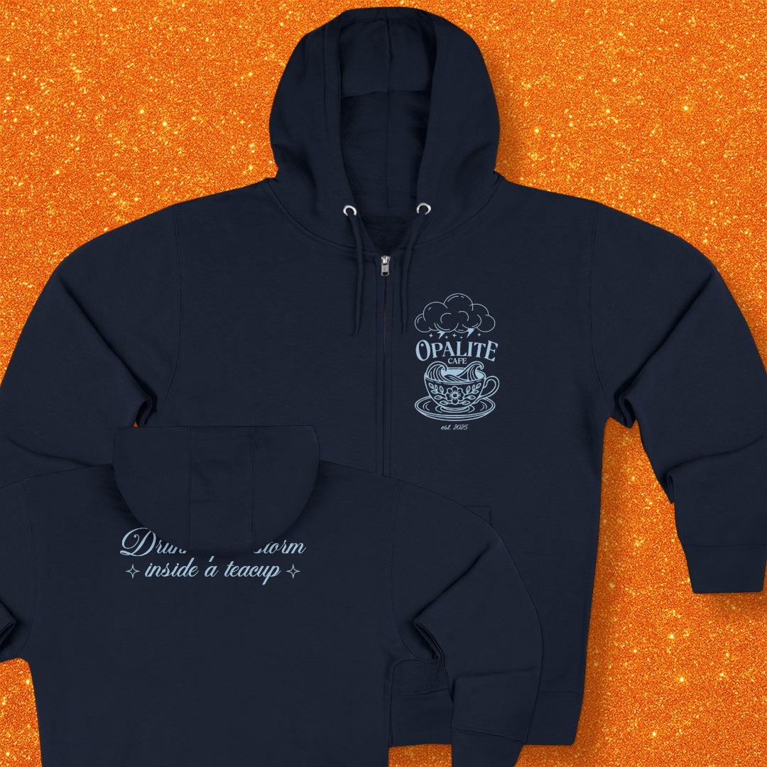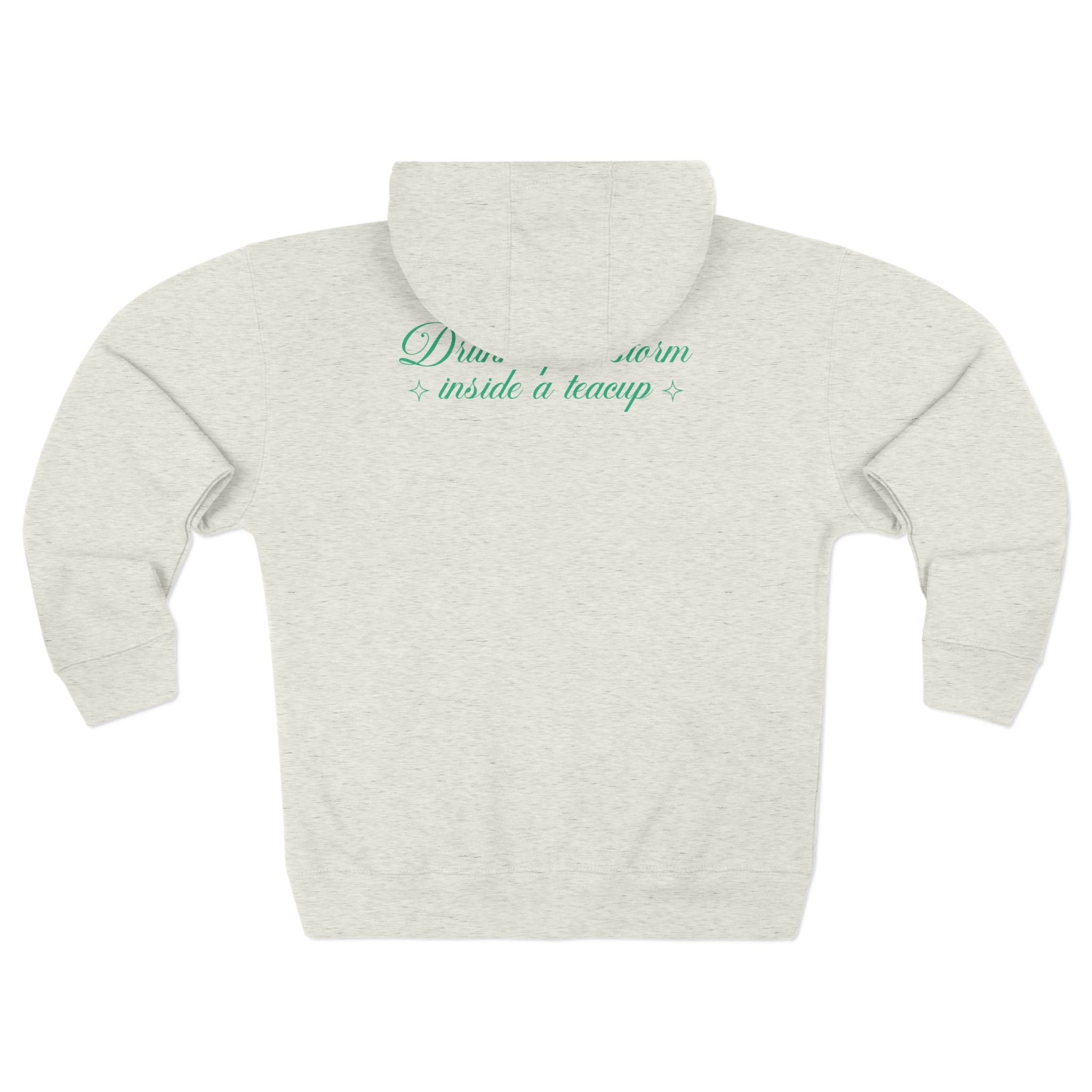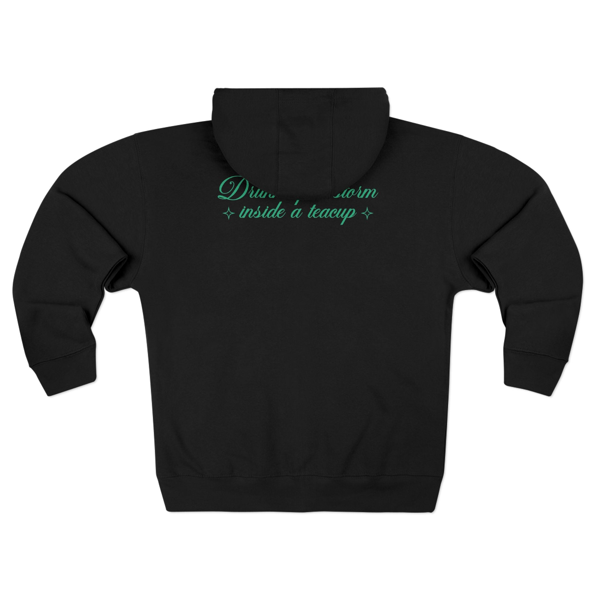 Cut from a buttery-soft charcoal fleece, this zip-up feels like a favorite from the first wear. The front features a delicate teacup-and-cloud illustration, hinting at drifting steam and tiny worlds inside your morning mug. Across the upper back, soft script reads “Drink up a storm inside a teacup,” a quiet, playful message meant to be noticed only by those who know.