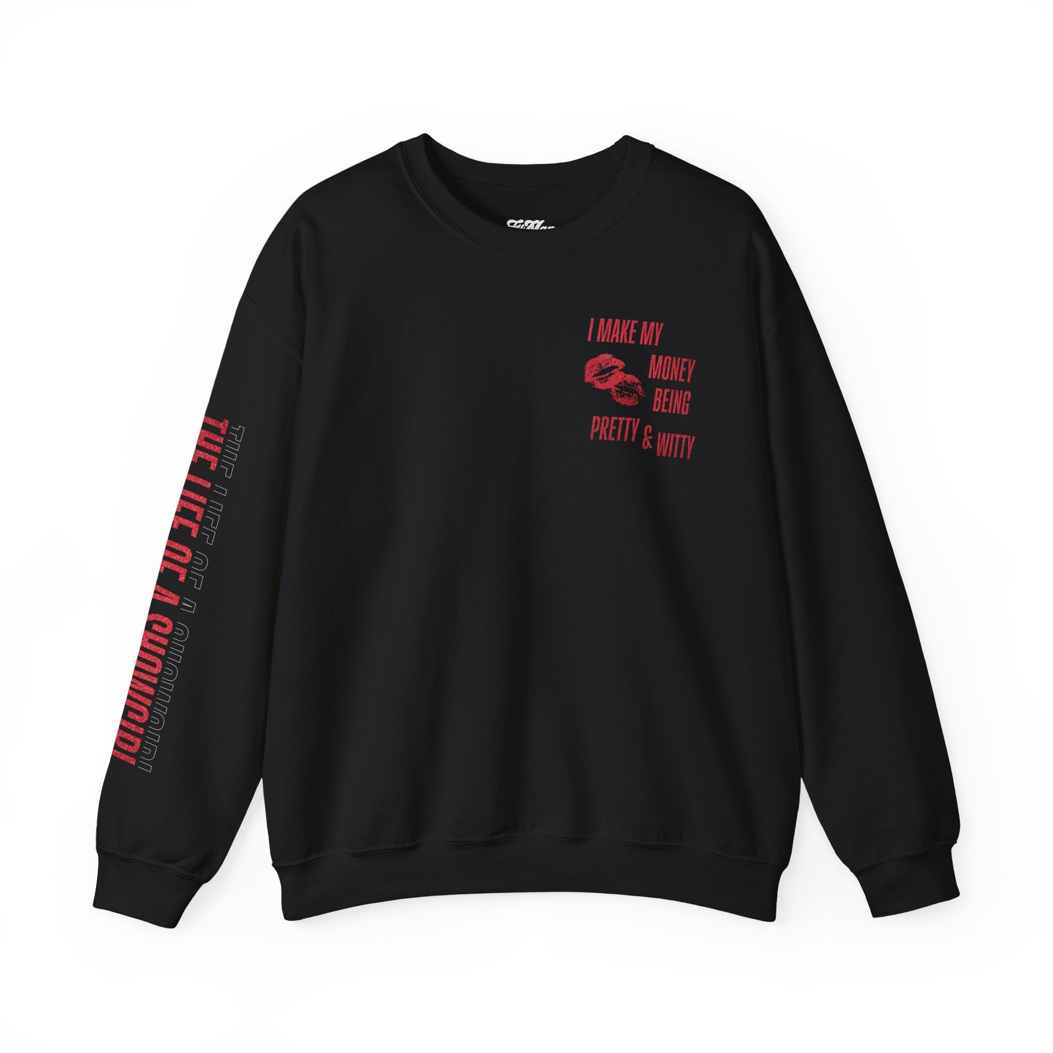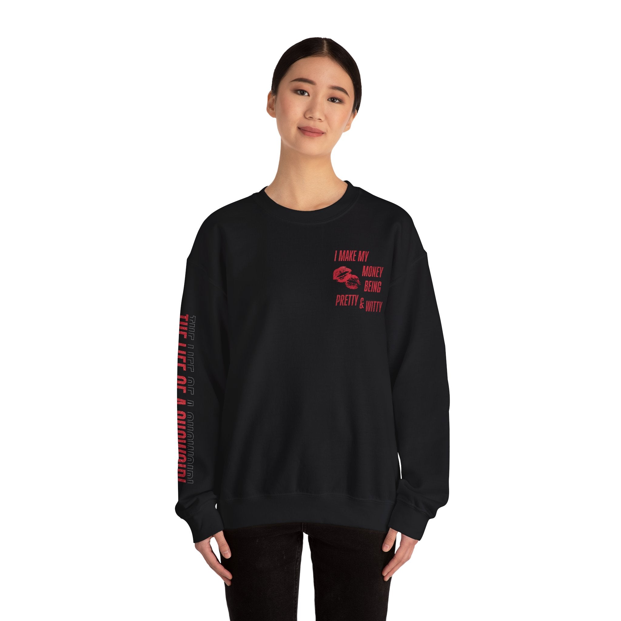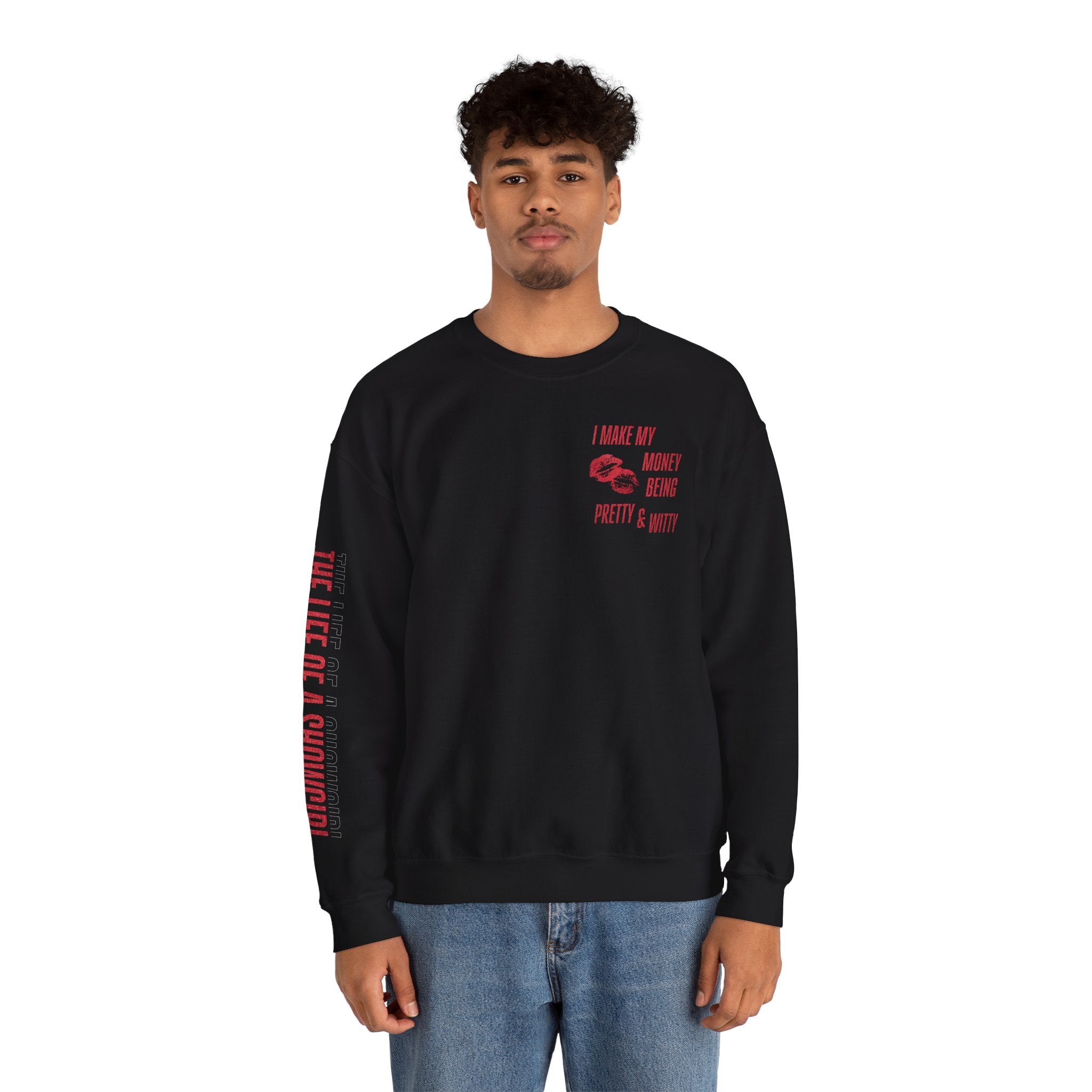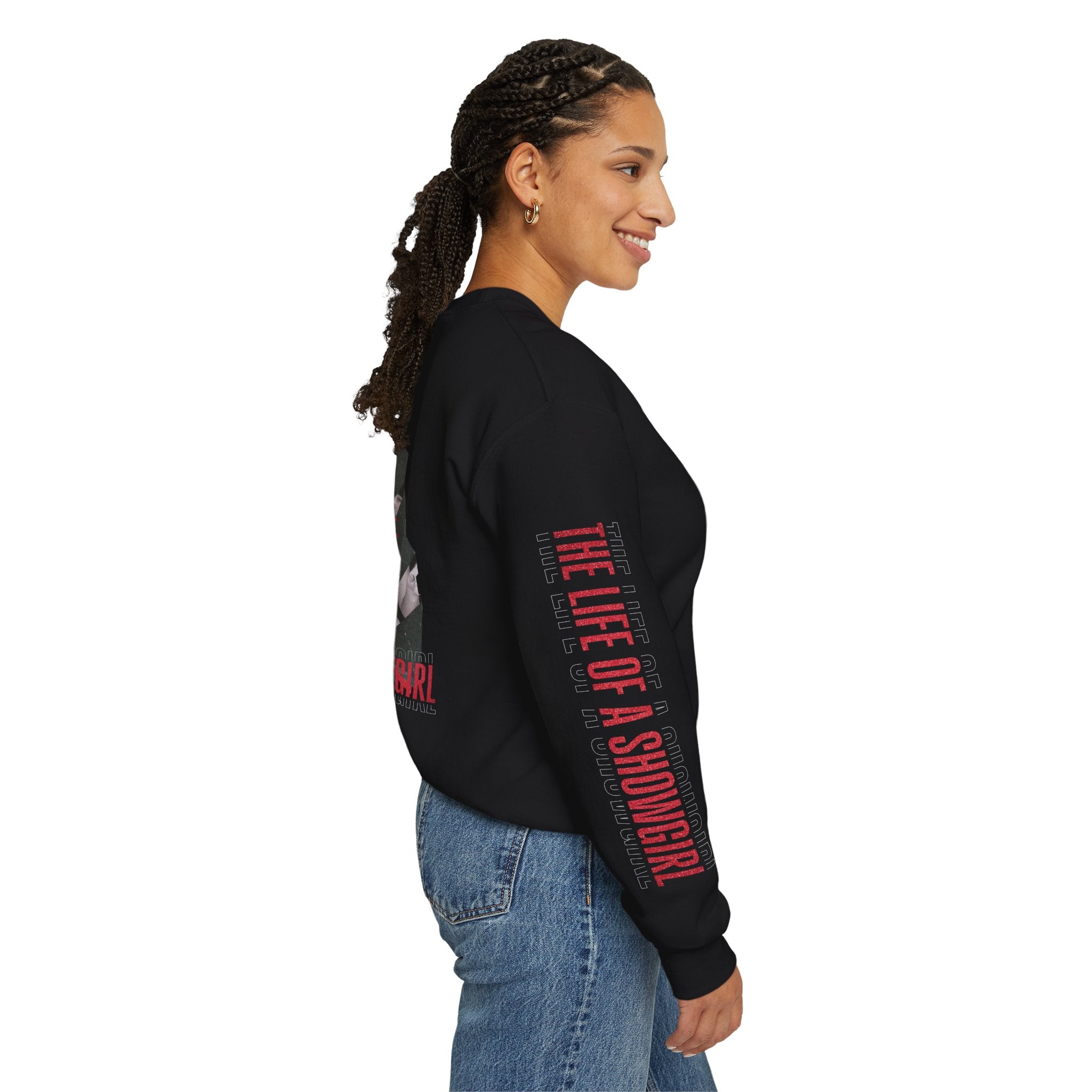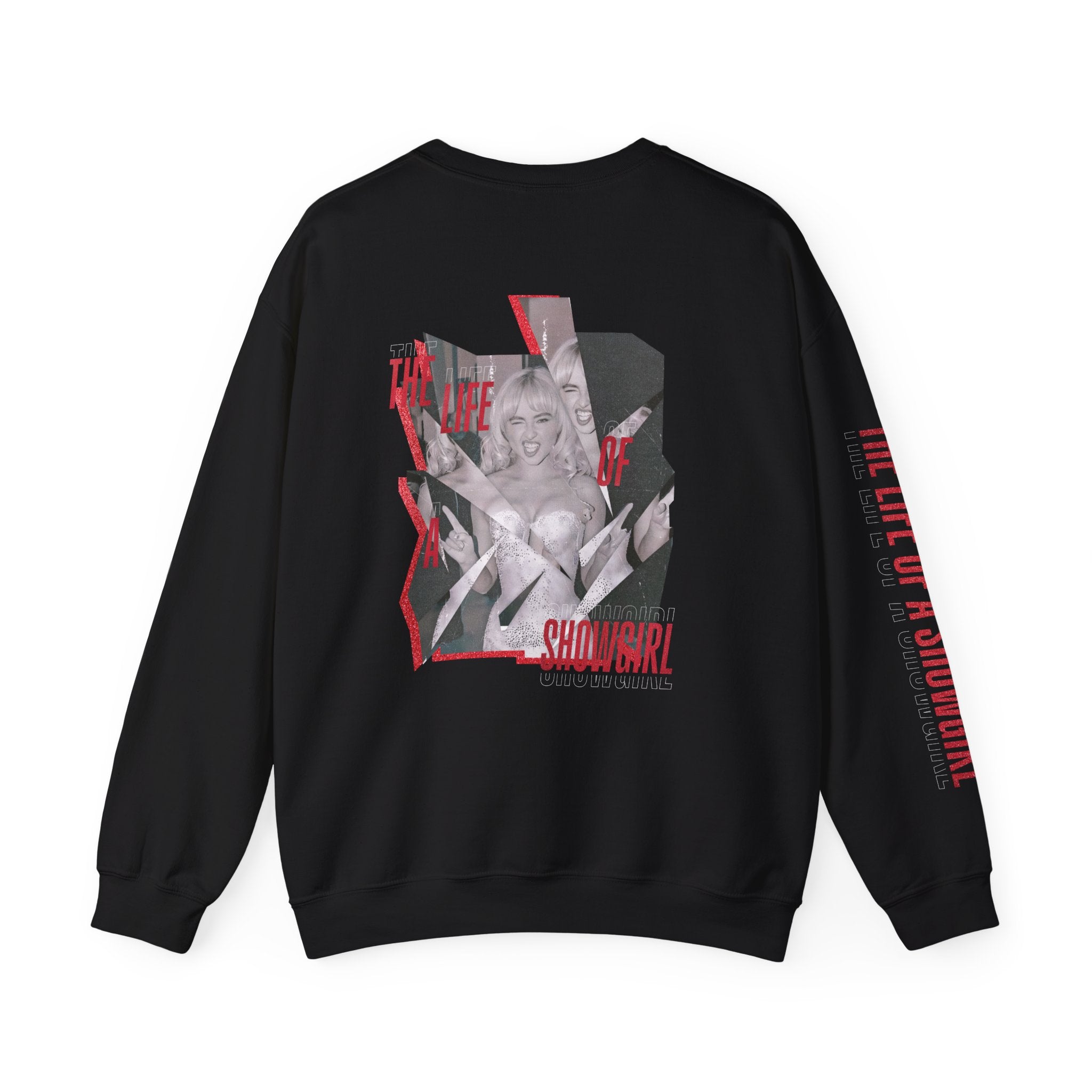 Celebrate Sabrina Carpenter’s glamorous “Life of a Showgirl” era with this retro-inspired graphic sweatshirt. Featuring a vintage pinup-style photo and bold red accent sleeve text, this cozy pullover perfectly captures Sabrina’s signature blend of playful confidence, old-Hollywood charm, and showgirl glamour.