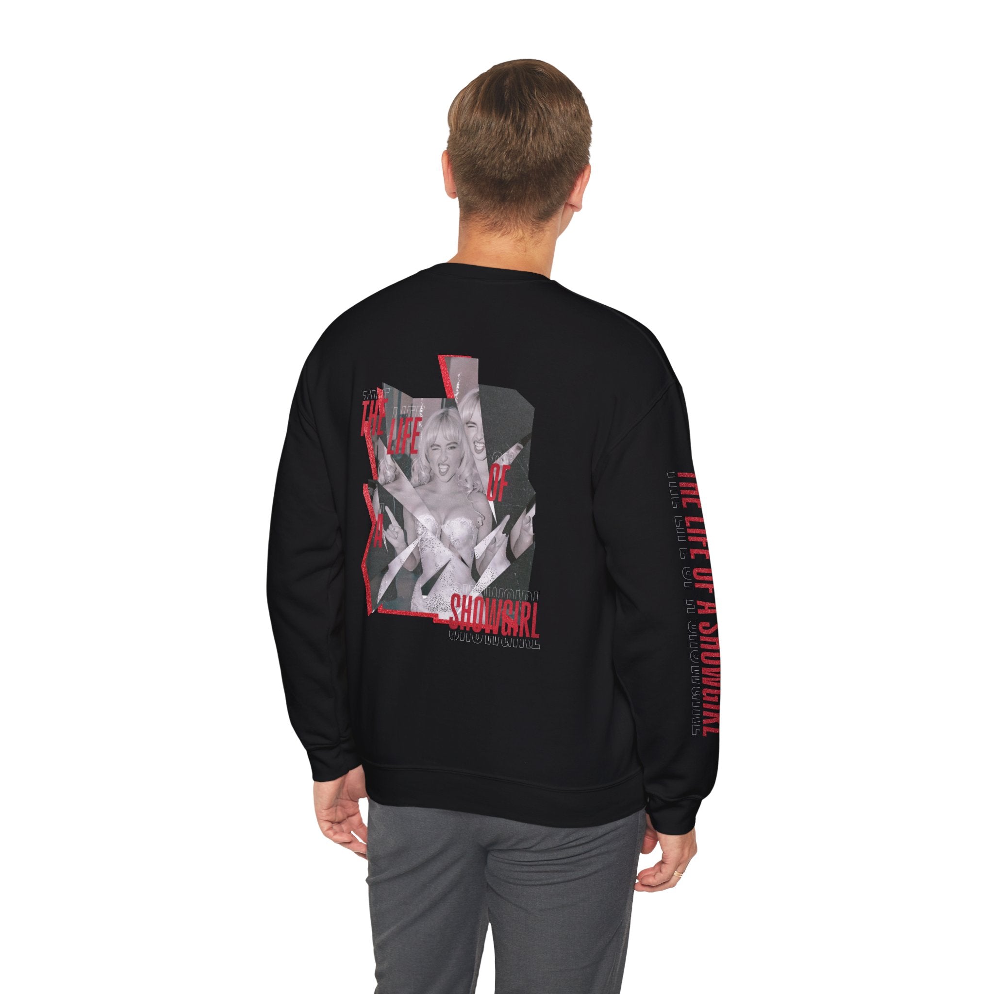 Life of a Showgirl inspired graphic with striking red accent sleeve text